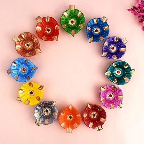 SATVIK 12 Pc Multicolor Clay Diya Terracotta Dia Traditional Puja Vilakku Oil Lamp Natural Mitti Diya Tea Light Welcome Diwali Deepawali Navratri Pooja Décorations Indian Housewarming Return Gift Item