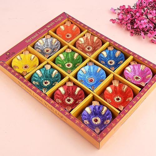 Package Contains: Set of 12 Pc Multicolor Designer Clay Diya. The Set comes in Premium Gift Packing., So no need to Re-Pack.