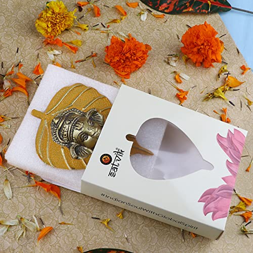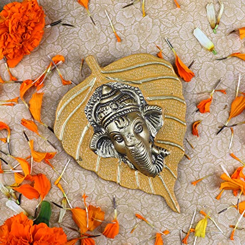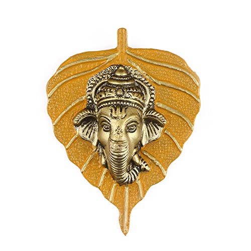 SATVIK Metal Pan Patta Ganesh Decorative Wall Hanging Showpiece Lord Ganesha on Leaf Home Decor. Indian Housewarming Return Gift for Bulk. Figurine Pooja Decoration Item Yellow
